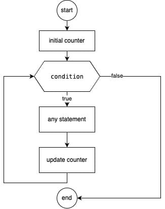 - มีการ initial ค่าตั้งต้น (อาจจะไม่มีก็ได้) เพื่อนับหรือใช้อัพเดทค่าใน loop