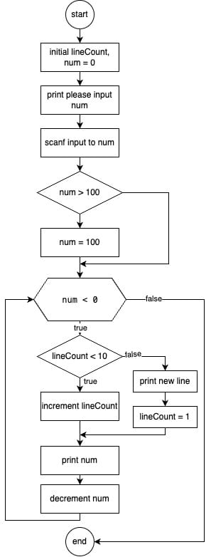- แสดงผลตัวเลข n ไปจนถึง 1 เมื่อรับค่าตัวเลข 1-100 เท่านั้น