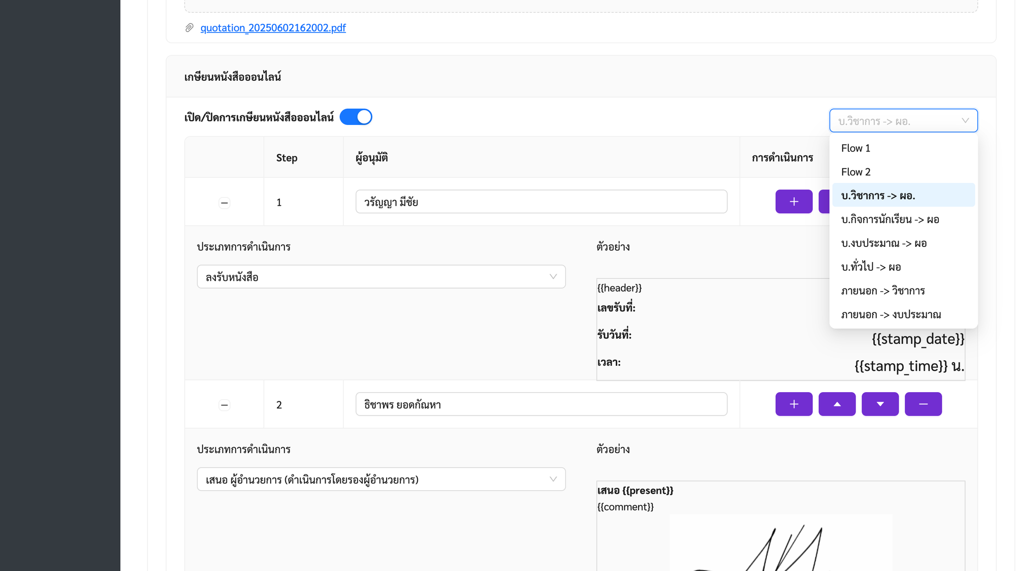- Develop extended service provide ability to inject approval flow to existing document, including multiple person, stamp, e-signature each step